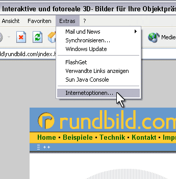 Im Microsoft Internet Explorer ist die Javascript- Option in der Regel bereits aktiviert. Um die Java- Option im Internet Explorer zu aktivieren gehen Sie wie folgt vor. Wählen Sie in der Menüleiste das Menü "Extras" aus und klicken dann auf den Menüpunkt "Internetoptionen".