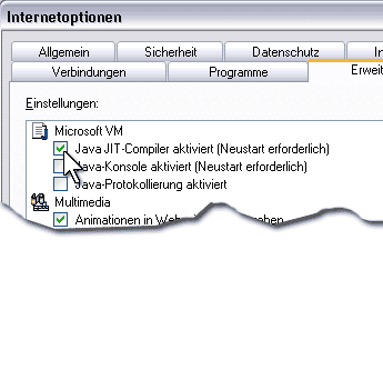 Sollte auf Ihrem Computer auch der Java-Compiler der Fa. Sun installiert sein, erkennbar an der vorhandenen Auswahloption "Java (Sun)", so ist es erfahrungsgemäß besser diesen zu deaktivieren (...das entsprechende Auswahlhäkchen - falls vorhanden - entfernen).